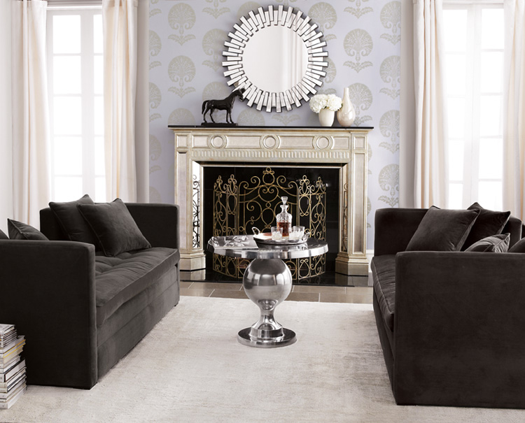 Delightfully sophisticated that’s the view,  start to finish. This look speaks to anyone who takes pleasure in being enveloped in a tailored, formal glamour. The geometric mirrors mingling with transitional contemporary  pieces make this space urbane, cosmopolitan, contemporary and exciting. Pairing formal and contemporary pieces is the start to this glamorous look,  mirrors add glitz, the art deco inspired chairs mixing with the neoclassical curvaceous lines in the fireplace layer this room and put it simply, over the top.