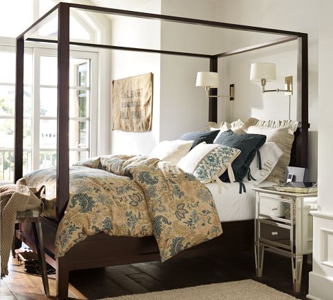 The tall, strong lines of this Shaker inspired bed take on drama in dark expresso wood and the addition of the canopy rails brings balance to the bed and the room, The mirrored nightstand is a contemporary counterpoint to the Shaker-style bed bridging that transition. Framed by the bed, the swing arm sconces become a focal point in this room.