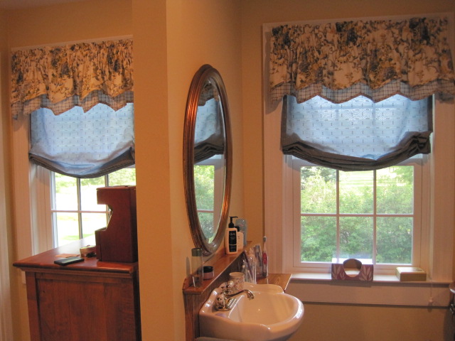 Valances were by Country Curtains, Custom Relaxed Romans in DuraLee, Eyelash Sheers, Pattern: 50813 Color: Lake