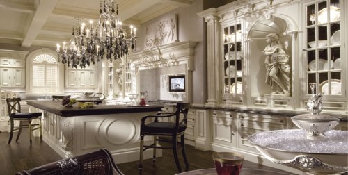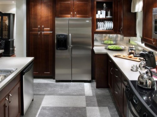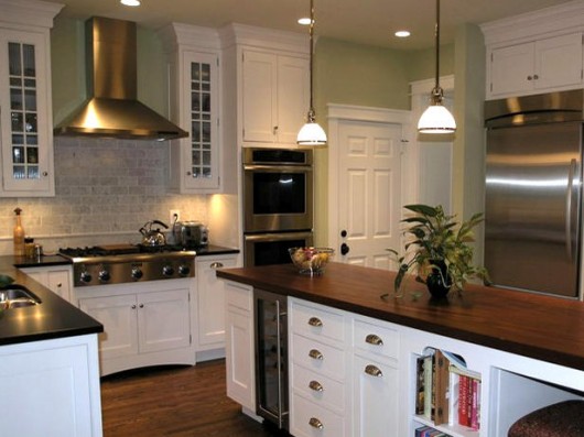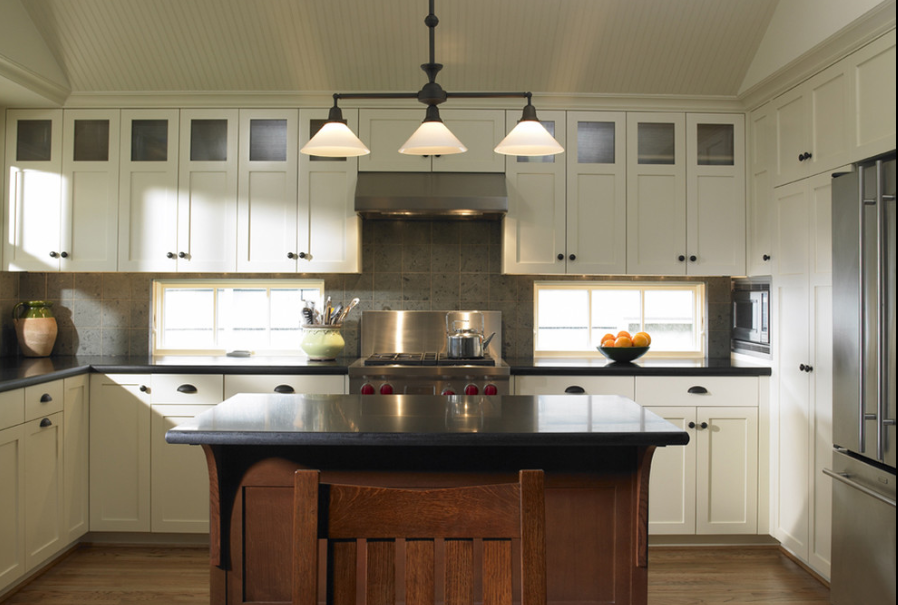 In the past few years we’ve seen former warehouse carts being cleanup and re-purposed as coffee tables across suburbia. Just like other rooms of the home, more and more elements of both traditional and industrial design will enter the home kitchens space. A coming together of the best of both worlds! We’re already seeing this trend of traditional shaker cabinetry, being topped with concrete counters, combined with a farm sinks, and topped off with a tall, goose-neck faucet that would be at home in any kitchen…Elements like brick along with wrought iron stools help accomplish this industrial look, while the Merillat cabinetry: Sutton Cliffs in Hickory gives this kitchen elements of traditional style.