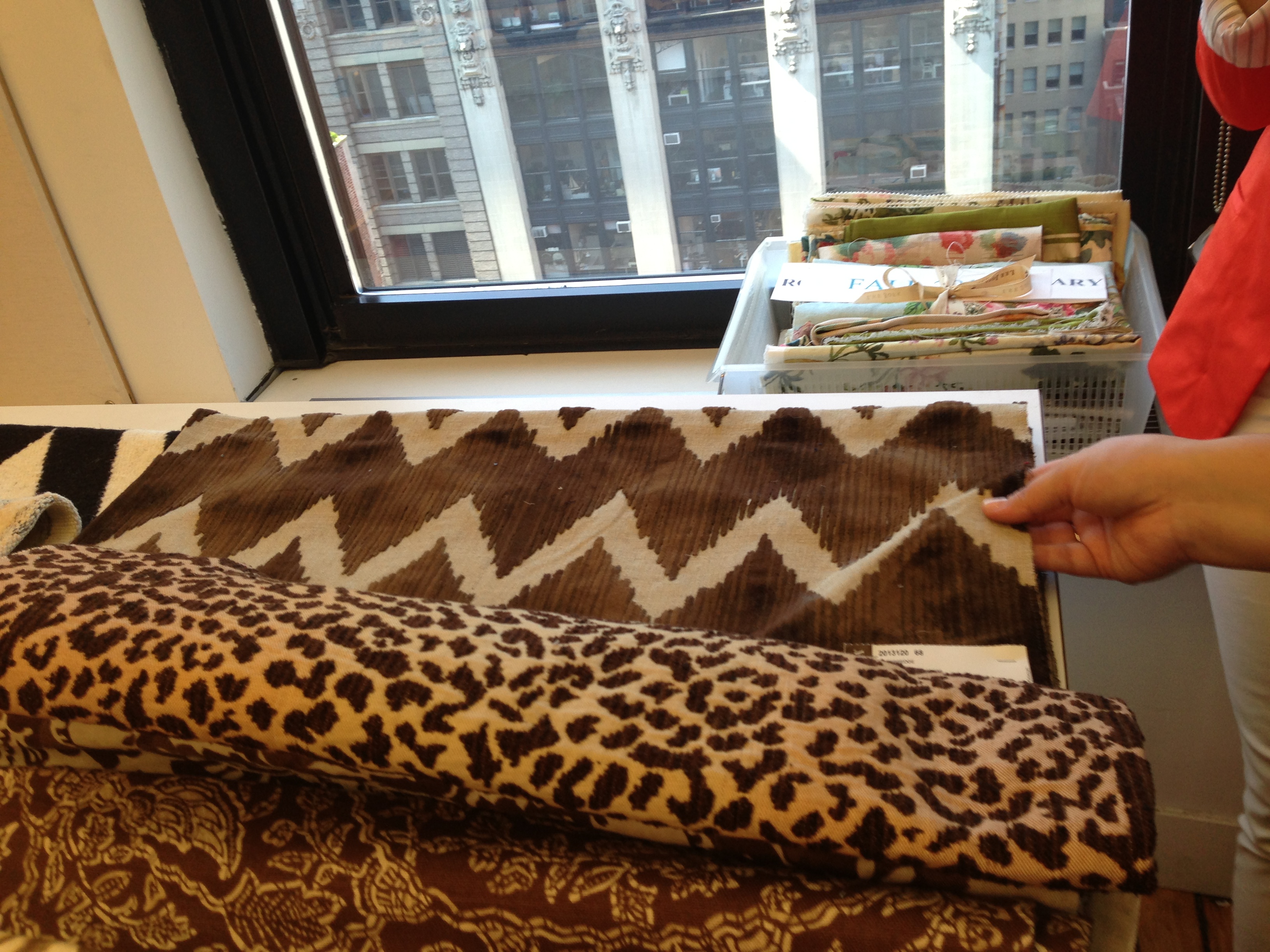 Yesterday was my day at Denise Maurer Interiors. We met with Ted Fall our Kravet consultant, he was excited to talk about some new fabrics, carpets and wall coverings from Kravet, Lee Jofa and Brunschwig & Fils. Here are some highlights from our meeting! Here is Ted  Fall holding up one of our favorite fabrics of the day!!!!