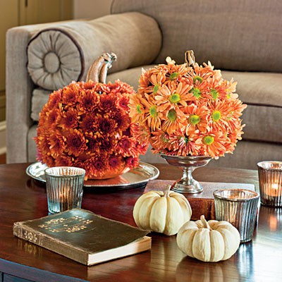 Love the Cinderella pumpkin in the urn!! The orange gourds are surprisingly versatile decorative items, especially when displayed in groups. Before you put away the urns and pots that held your summer flowers on the front porch, use them as a base for your larger pumpkins, and add elegance to your display.