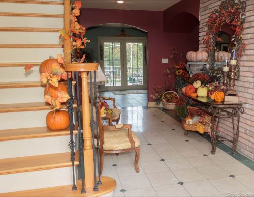 Above our entry, I used some fall garland and floral arrangements, gourds and a beautiful blue Hubbard squash (that will be eaten after the holiday!!), this array of color will great me in the morning as I descend from my bedroom to discover yet another glorious fall day!